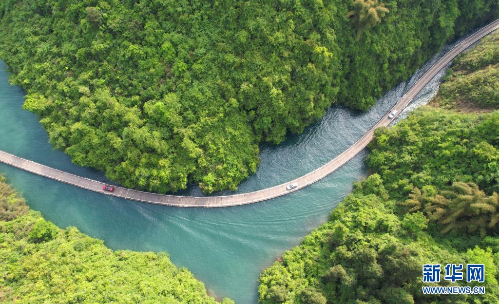 5月2日,游客在湖北省恩施土家族苗族自治州宣恩縣獅子關(guān)景區(qū)水上棧道駕車(chē)游玩(無(wú)人機(jī)照片)。新華社發(fā)(王俊 攝)