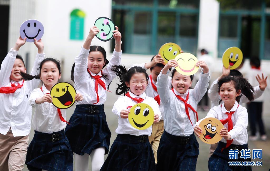 5月7日,江蘇省揚州市汶河小學的學生們在“笑迎世界微笑日”活動中手舉笑臉卡做游戲。世界精神衛生組織將每年的5月8日定為“世界微笑日”,希望通過微笑促進人類身心健康,增進社會和諧。新華社發(孟德龍 攝)