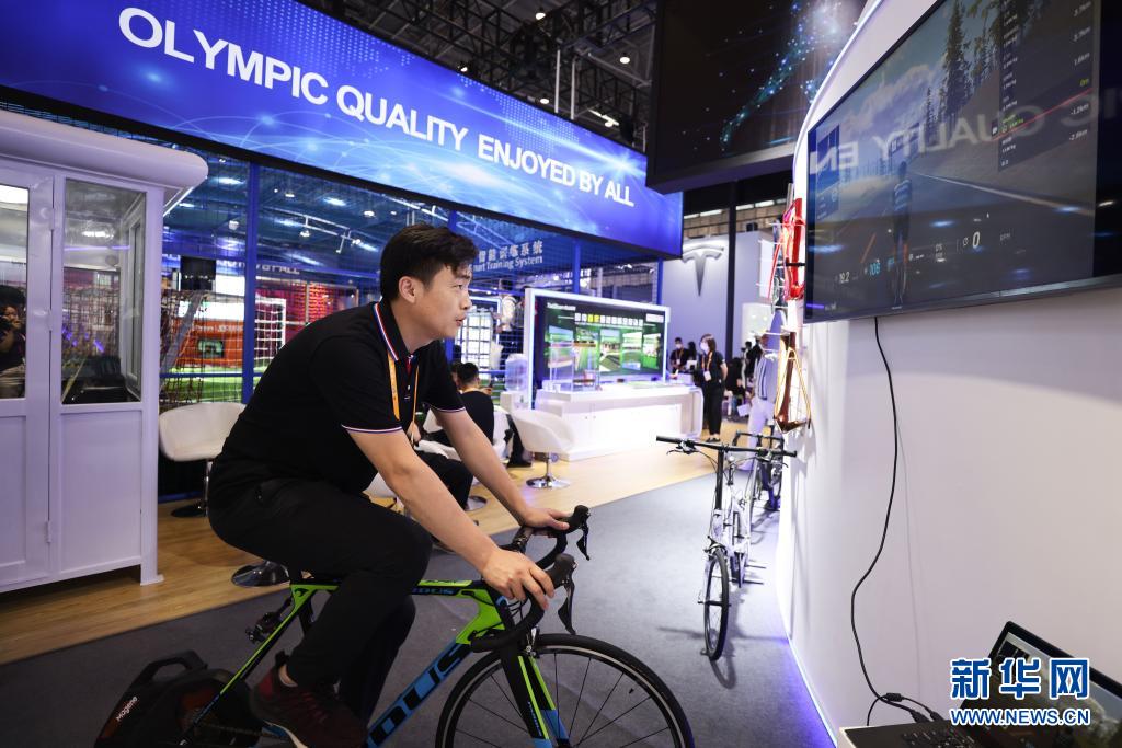 5月7日,觀眾在消博會(huì)現(xiàn)場(chǎng)體驗(yàn)自行車。