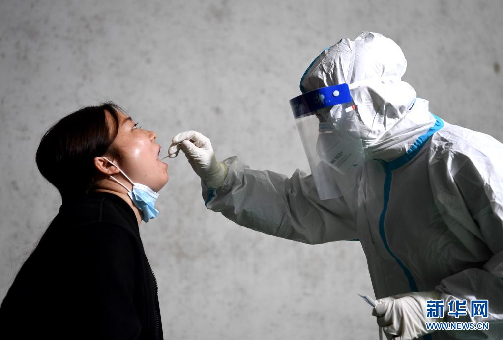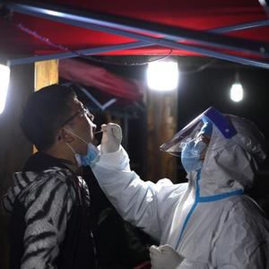 5月16日晚,在肥西縣上派鎮一小區,工作人員為居民進行核酸采樣。