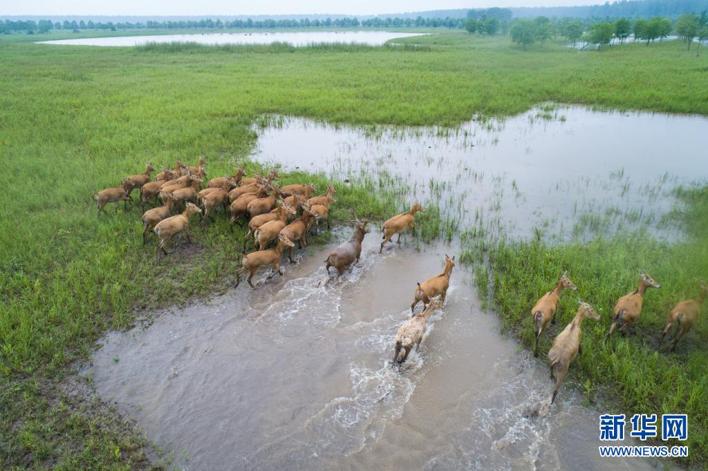 5月17日,一群麋鹿在石首麋鹿國家級自然保護(hù)區(qū)內(nèi)活動(無人機(jī)照片)。新華社記者 肖藝九 攝