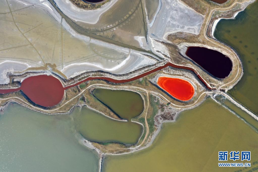 近日,隨著氣溫不斷升高,山西運城鹽湖呈現五彩斑斕的景象。