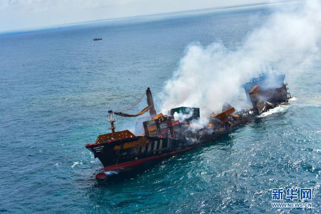 這是6月2日在斯里蘭卡科倫坡港附近拍攝的逐漸下沉的起火貨船“X-PRESS PEARL”號(hào)。