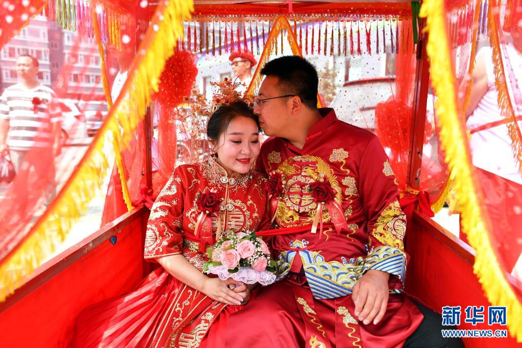 新郎周海云和新娘關美乘坐花轎前往婚禮儀式現場(6月15日攝)。