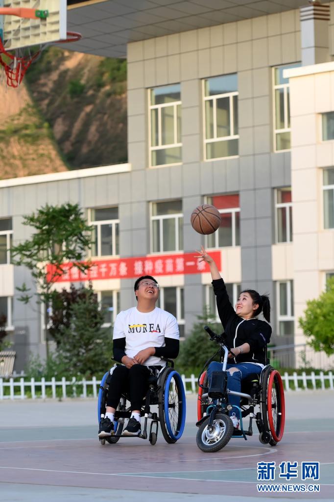 在山西省呂梁市石樓縣體育中心,周海云(左)和關美坐著輪椅打籃球(6月1日攝)。新華社發(劉亮亮攝)