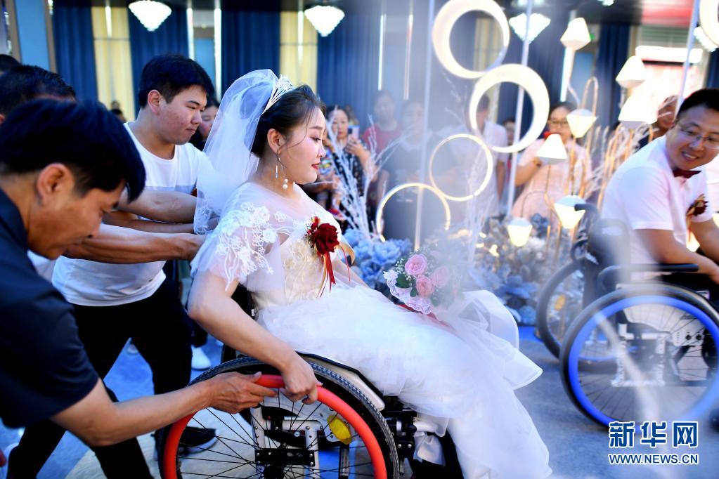 新娘關美在親友的幫助下坐輪椅來到婚禮儀式現場(6月15日攝)。新華社記者 詹彥 攝