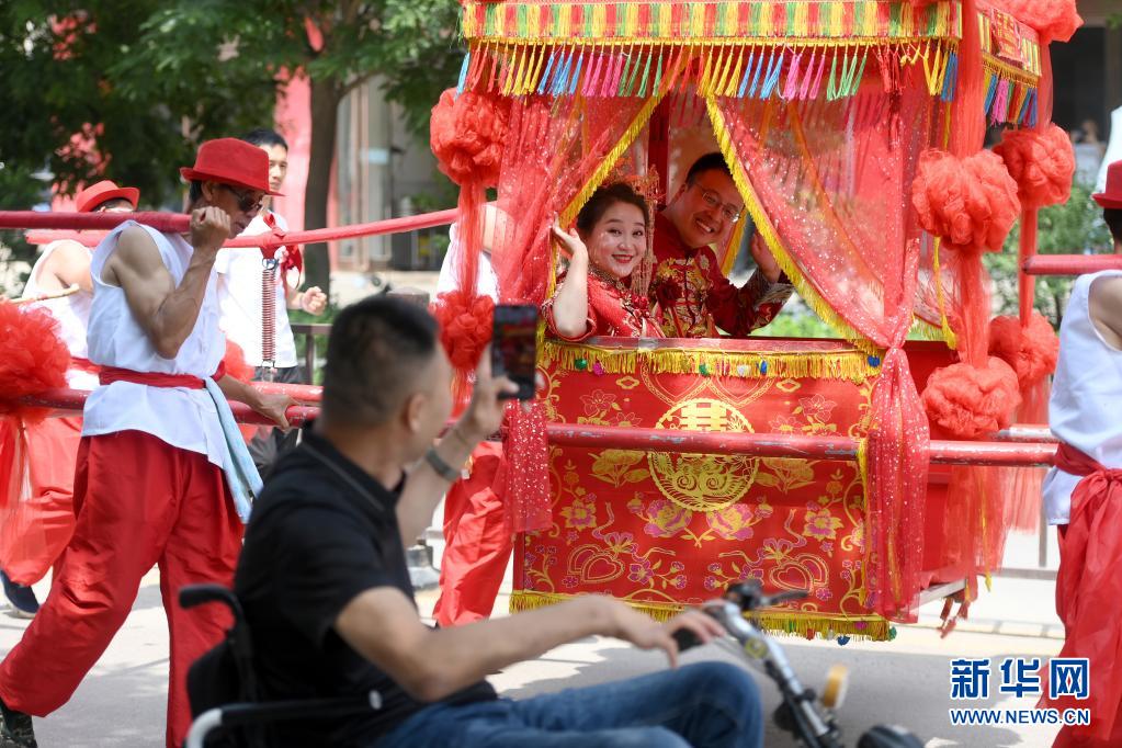 新郎周海云和新娘關(guān)美乘坐花轎前往婚禮儀式現(xiàn)場(chǎng)(6月15日攝)。新華社發(fā)(劉亮亮攝)