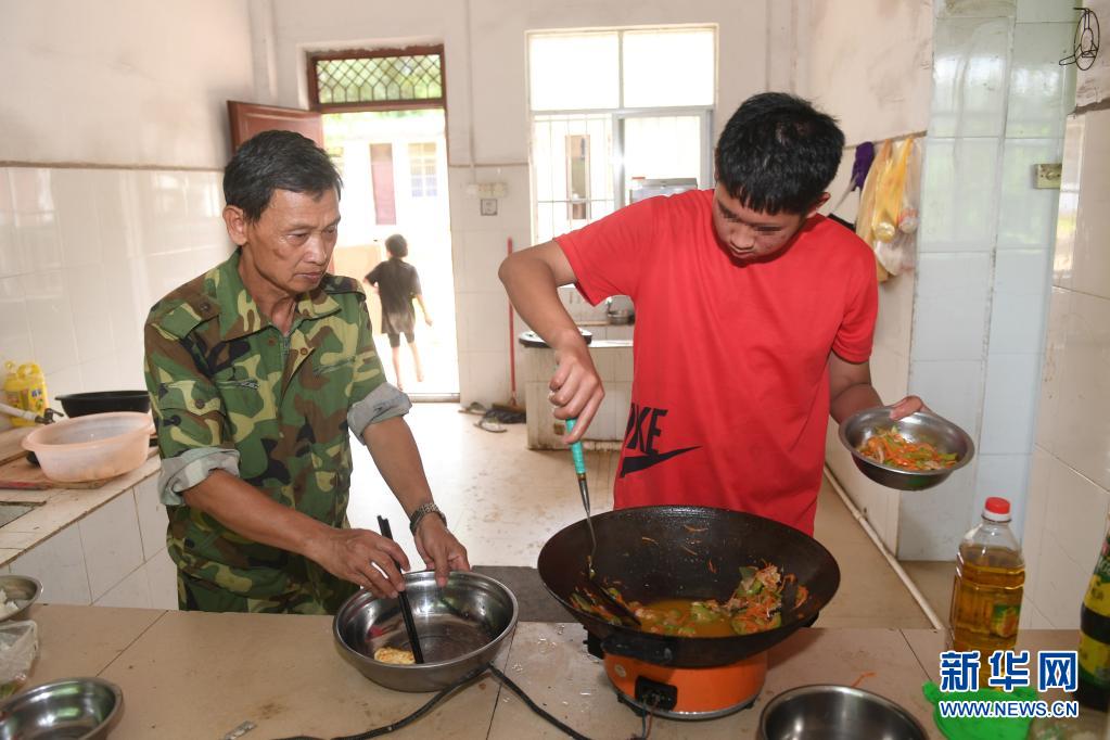 在廣西上思縣那琴鄉中心小學逢通村教學點,梁志雄老師在教一名學生盛菜(6月16日攝)。新華社記者 陸波岸 攝
