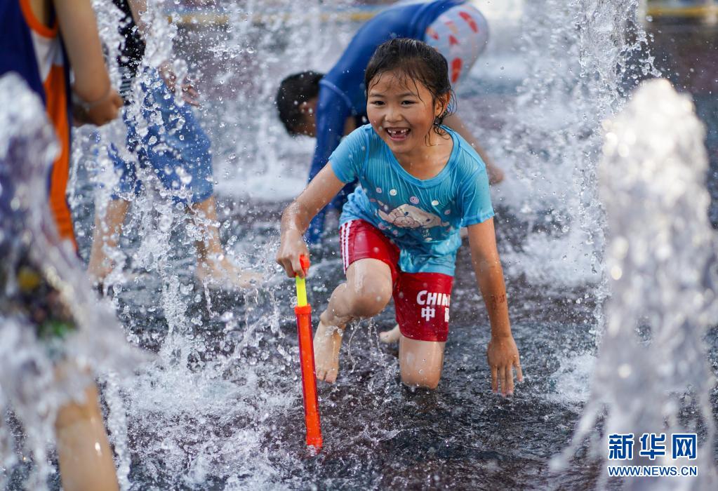 6月20日,孩子們在北京華熙LIVE·五棵松商業街區一處噴泉戲水。
