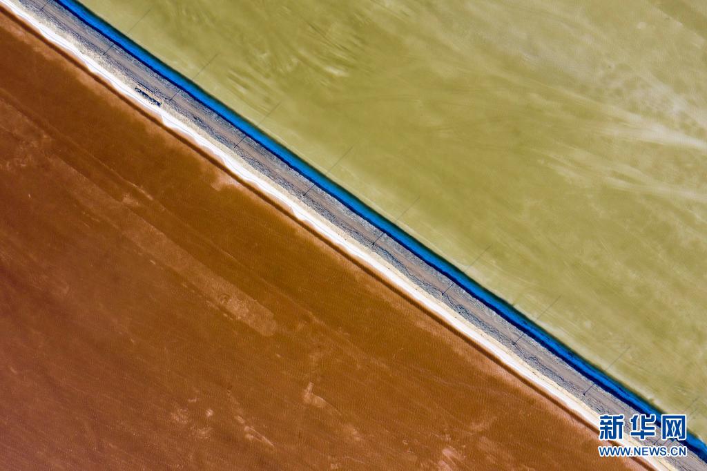 這是在新疆和布克賽爾蒙古自治縣瑪納斯鹽湖中鹽宏達鹽業生產基地拍攝的一處灘曬池(6月21日攝,無人機照片)。