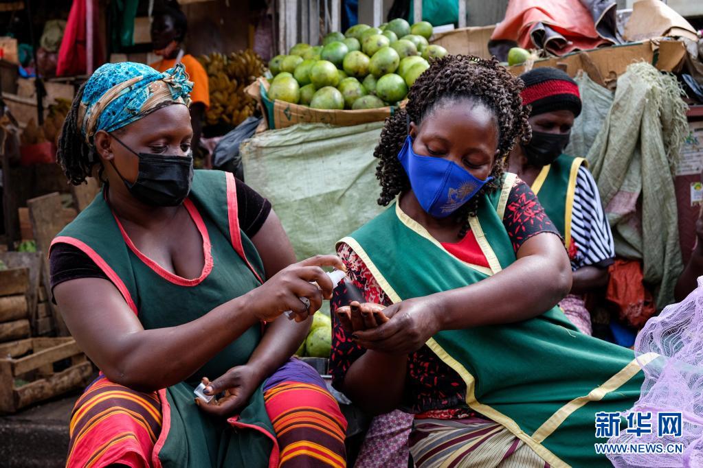 6月23日,商販在烏干達(dá)坎帕拉的納卡塞羅市場使用手部消毒液。