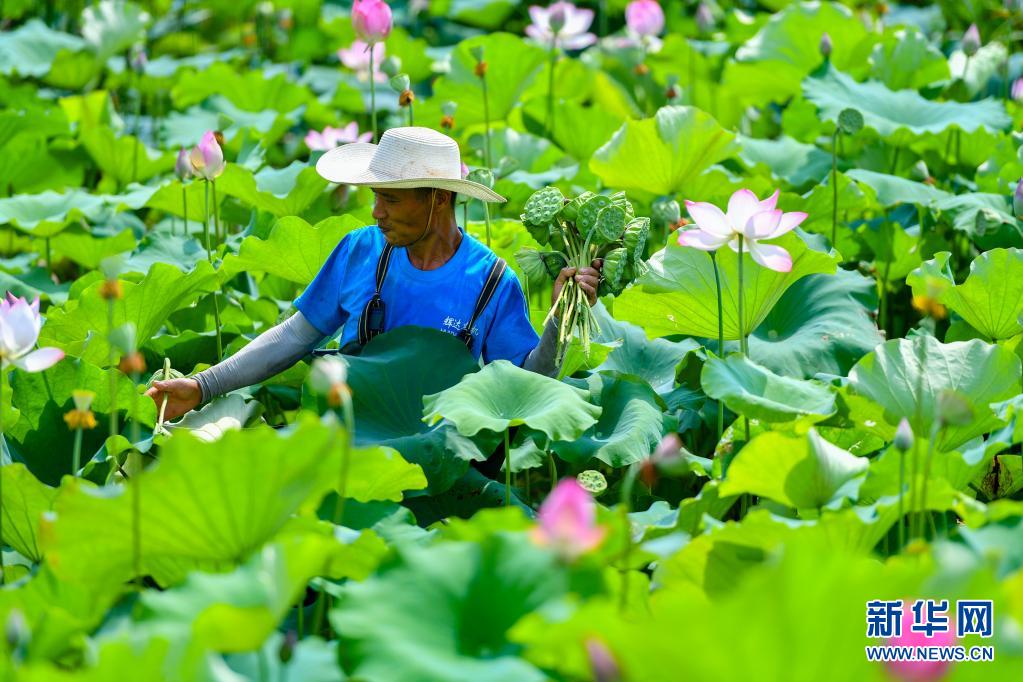 7月11日,在湖南省湘潭市雨湖區姜畬鎮聯映村,蓮農在荷塘采摘蓮蓬。新華社記者 陳澤國 攝