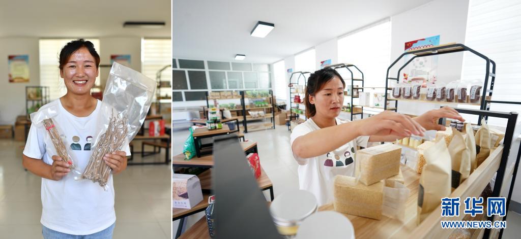 拼版照片:左圖為楊王芳在展示山西省平順縣產(chǎn)的黨參;右圖為楊王芳在平順縣龍鎮(zhèn)村電商服務(wù)中心整理貨架(7月8日攝)。近年來,平順縣大力發(fā)展電子商務(wù),開展直播培訓(xùn)、孵化、就業(yè)指導(dǎo)等,努力培養(yǎng)農(nóng)村電商人才。2019年初,一直在外打工的楊王芳得知村里發(fā)展電子商務(wù),覺得前景廣闊,回到村里加入電商隊(duì)伍。隨著電商飛速發(fā)展,龍鎮(zhèn)村搭上了“數(shù)字快車”,村里的農(nóng)副產(chǎn)品供不應(yīng)求,黨參、松花粉、小雜糧等成為熱賣產(chǎn)品。