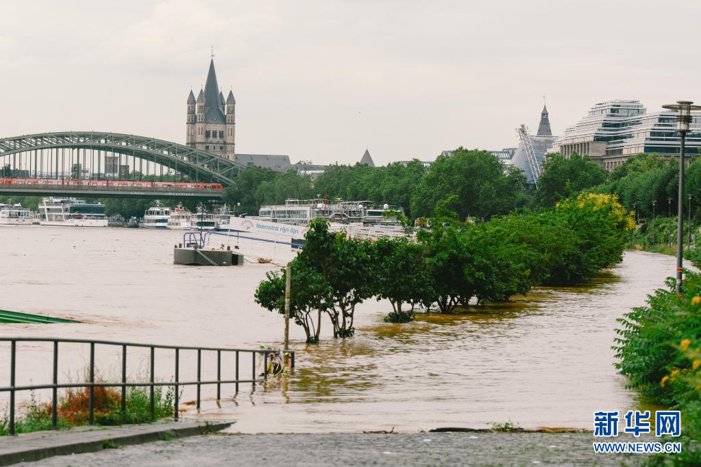 這是7月15日在德國西部城市科隆拍攝的水位上漲的萊茵河。