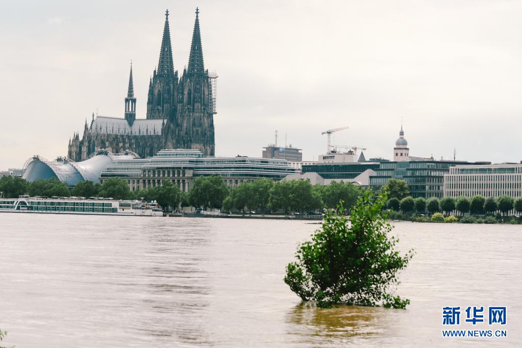 這是7月15日在德國西部城市科隆拍攝的水位上漲的萊茵河。
