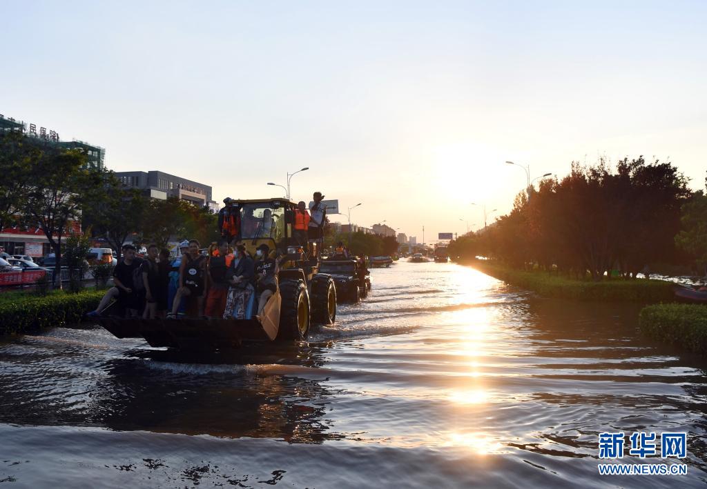 7月26日,在河南省衛(wèi)輝市,受困群眾乘坐鏟車轉(zhuǎn)移。