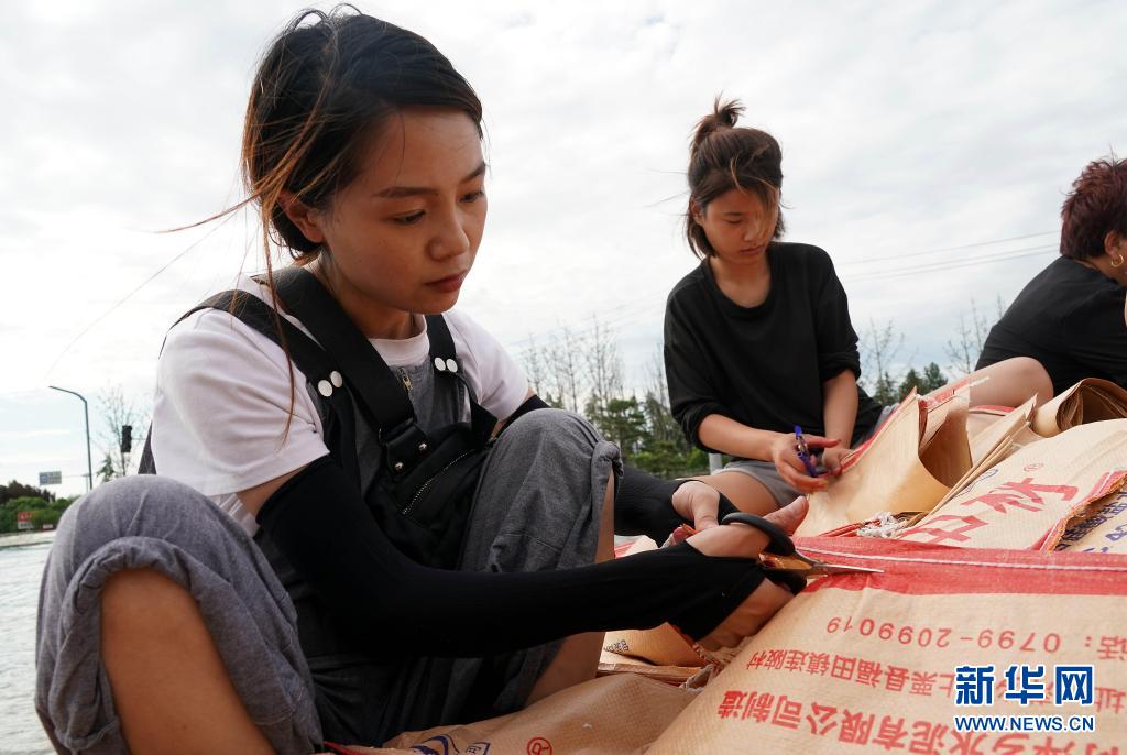 當日,在河南省鶴壁市浚縣傅莊堤上,不少群眾自發前來和救援人員一起裝沙袋、運沙袋,共筑堤壩。受持續強降雨影響,浚縣防汛形勢嚴峻,傅莊堤主要為浚縣縣城及26個村莊提供保護。新華社記者 李安 攝