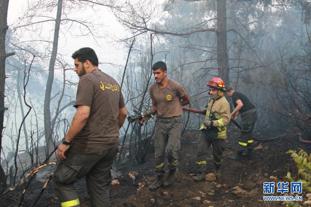 7月29日,黎巴嫩民防人員在阿卡爾省火災現場滅火。