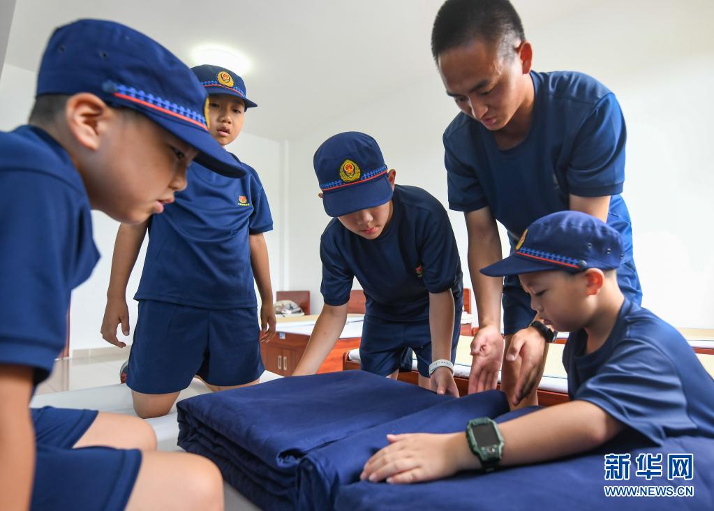 在四川省森林消防總隊(duì)特勤大隊(duì),消防員畢成武(右二)教孩子們整理內(nèi)務(wù)(7月27日攝)。