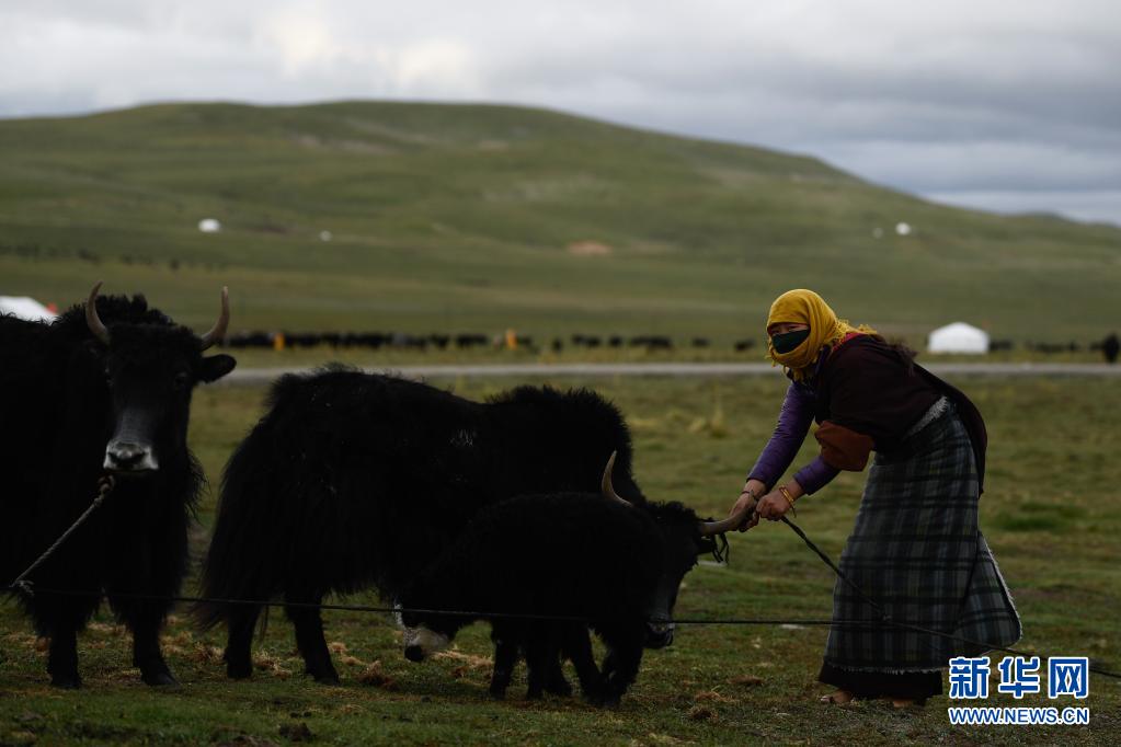 8月3日,在瑪沁縣當(dāng)洛鄉(xiāng)貢龍村的夏季草場(chǎng)上,牧民在拴牦牛。