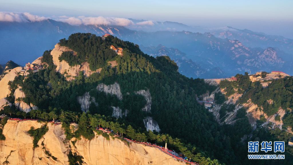 晨曦初露,位于陜西省渭南市的華山景區沐浴在霞光之中,景色壯美。