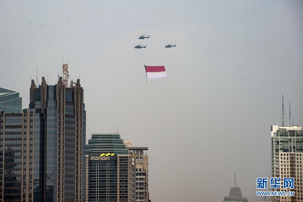 8月17日,懸掛印度尼西亞國旗的直升機(jī)飛過雅加達(dá)上空。8月17日是印度尼西亞獨立日。新華社發(fā)(維里攝)
