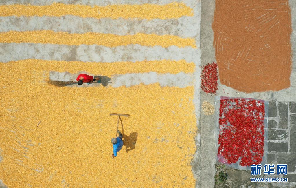 立秋過后,貴州省赤水市農(nóng)民種植的水稻、高粱、玉米、辣椒等農(nóng)作物迎來收獲季,當(dāng)?shù)卮迕駬屪デ绾锰鞖鈱⑹斋@的農(nóng)作物鋪放在房前屋后的壩子中進(jìn)行晾曬,構(gòu)成一幅幅美麗的“曬秋圖”。