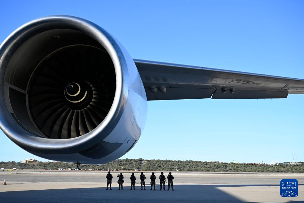 12月3日,在委内瑞拉首都加拉加斯附近的迈克蒂亚西蒙·玻利瓦尔国际机场,士兵在一架从墨西哥起飞的遣返移民航班旁警戒。