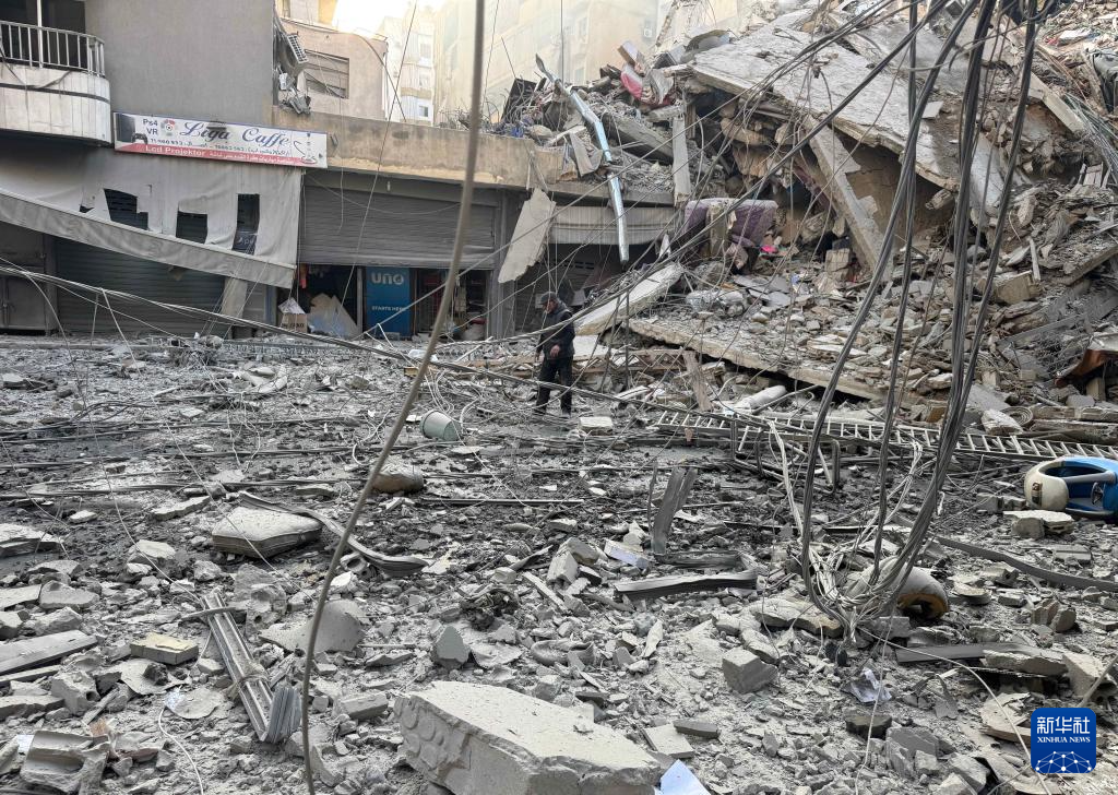 3月7日,在黎巴嫩首都贝鲁特南郊,一名男子行走在被以色列袭击摧毁的建筑废墟中。