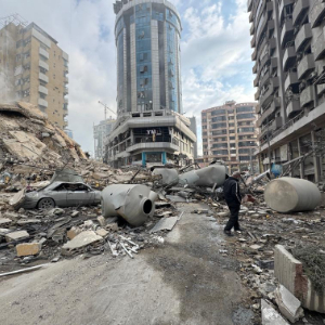 3月7日,在黎巴嫩首都贝鲁特南郊,一名男子行走在以色列袭击后的街道上。