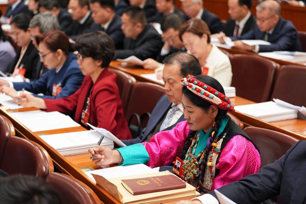 3月5日,全国人大代表次仁措姆出席十四届全国人大四次会议开幕会。