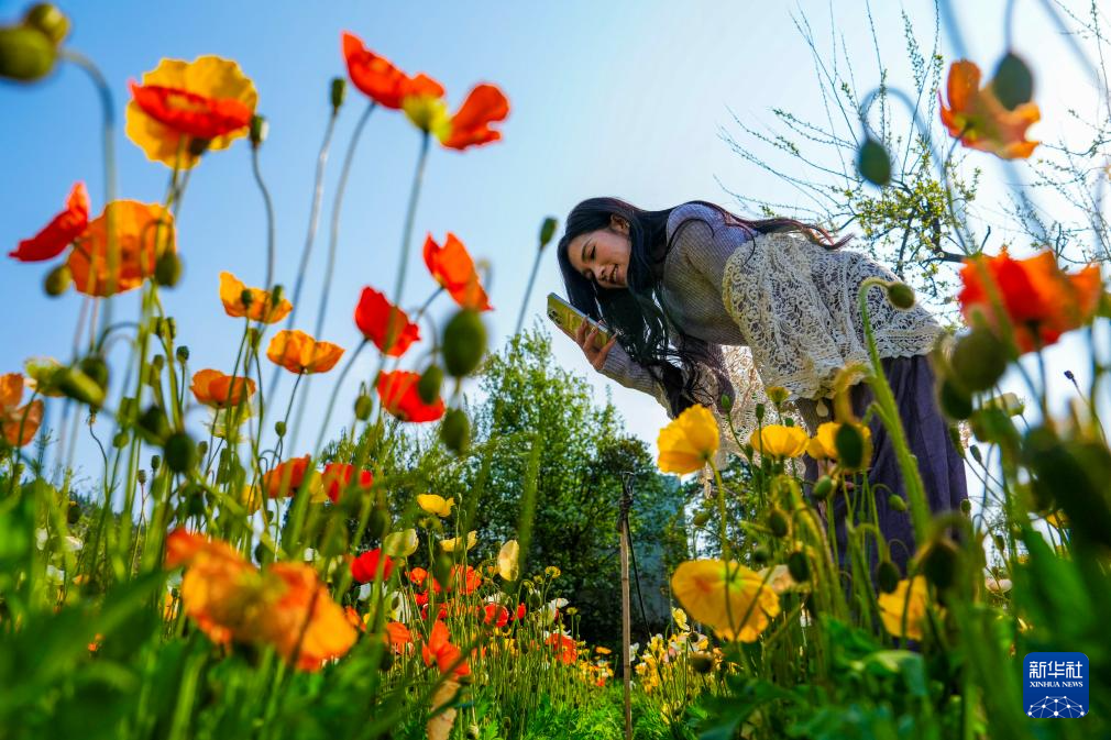 3月10日,一名游客在昆明名花谷的虞美人花丛旁拍照。
