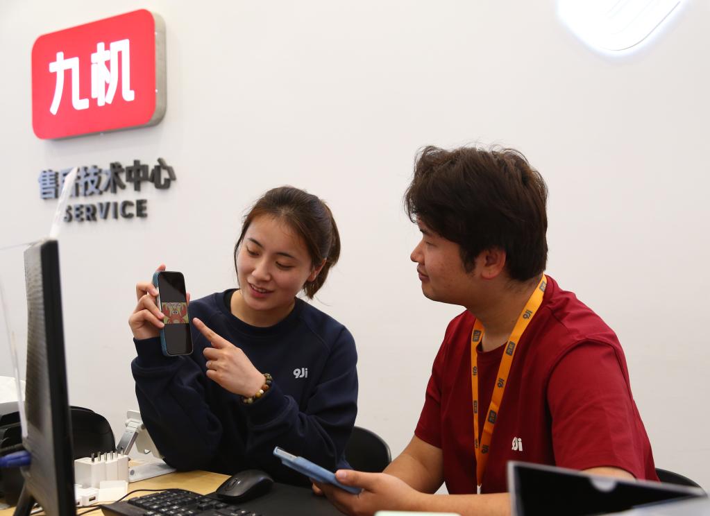 3月11日,在云南省腾冲市一手机专卖店内,工作人员在和同伴交流开源AI智能体“龙虾”的操作体验。