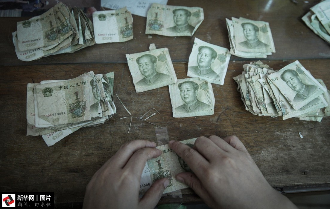 點鈔中心的員工在修補殘破的人民幣。