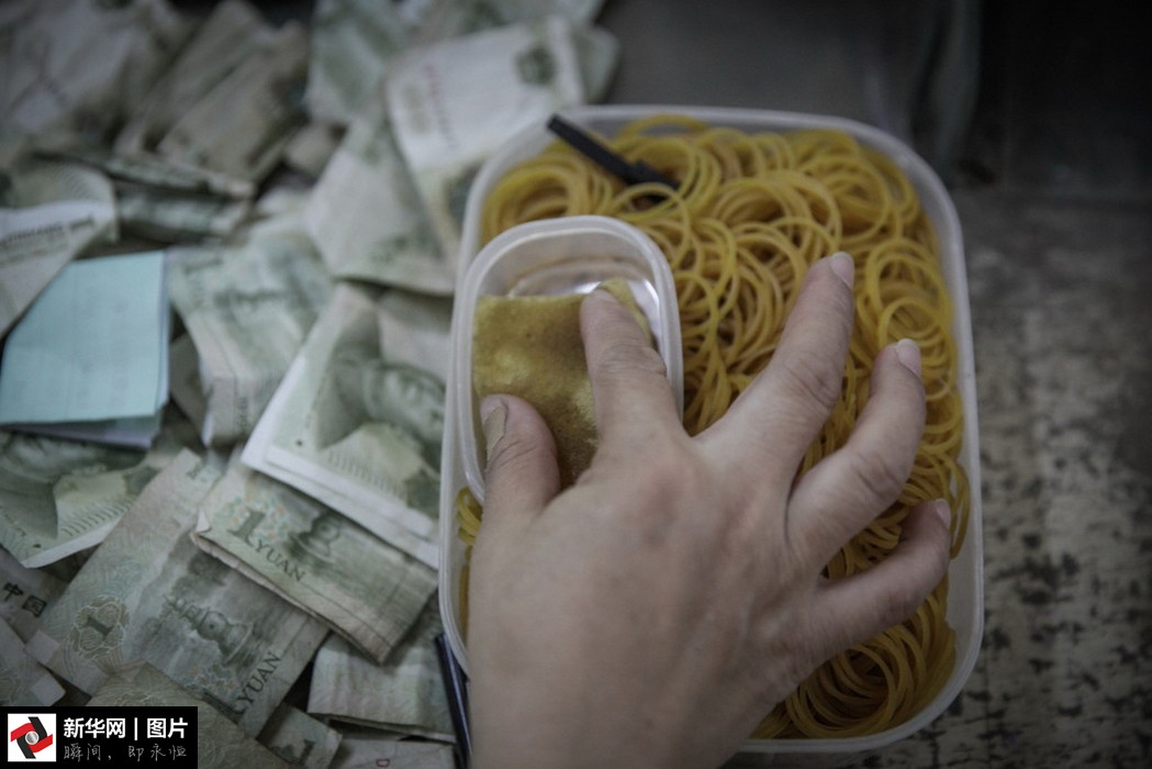 點鈔員肖冬常年累月的坐著重復數錢的動作,讓她的腰椎和頸椎常常感到不適,“轉眼間,已經當了20多年的點鈔員,這些年數過多少錢肯定沒有準確數據了,從一天數幾百張到如今的一萬多張,是時間教會人成長。”圖為點鈔員沾濕手指準備點鈔。