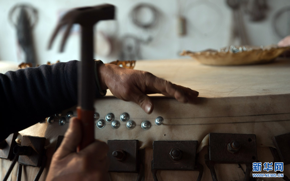 1月17日,在藁城黃家莊河北名華樂(lè)器制作有限公司內(nèi),工人正在釘釘子固定鼓皮。河北石家莊藁城戰(zhàn)鼓表演及其制作工藝,2016年被評(píng)為河北省級(jí)非物質(zhì)文化遺產(chǎn)。據(jù)藁城戰(zhàn)鼓的傳承人胡造寶介紹,藁城戰(zhàn)鼓源自架鼓,在清末時(shí)吸收了武術(shù)動(dòng)作,演變成了戰(zhàn)鼓。藁城戰(zhàn)鼓表演時(shí)配合鑼、鈸一起演奏,鼓點(diǎn)激昂,讓人振奮。藁城戰(zhàn)鼓需經(jīng)過(guò)挖鼓幫、蒙鼓皮、踩鼓等近二十道工序,平均耗時(shí)十天左右才能制作完成。新華社發(fā)(蒲東峰 攝)