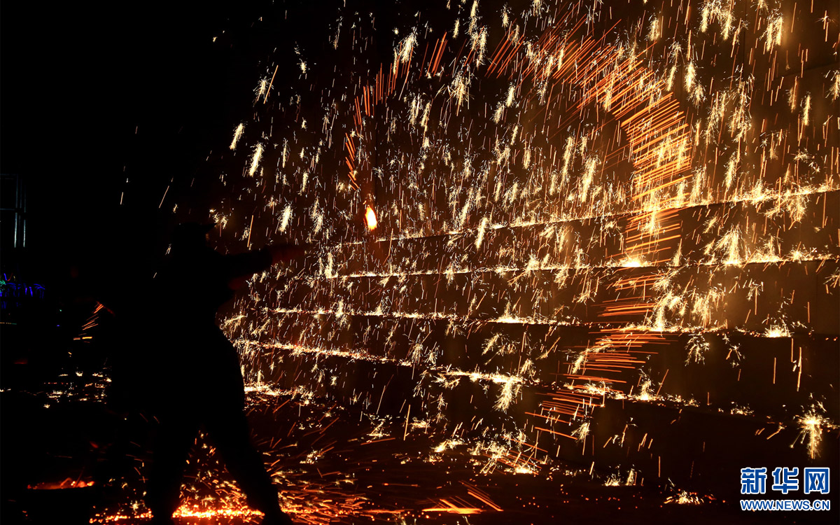 1月12日,磁縣本地匠人在“打鐵花”。當(dāng)日,河北磁縣開(kāi)始舉行“打鐵花”慶新年活動(dòng)。“打鐵花”是以小煉鐵爐將生鐵化成鐵水后,用木板將鐵水加鋸末打上天空,鋸末在空中燃燒形成“鐵花火雨”四濺飛揚(yáng)的景象。打鐵花”是當(dāng)?shù)貧v史悠久的民俗娛樂(lè)活動(dòng)。新華社發(fā) (趙鴻宇攝)