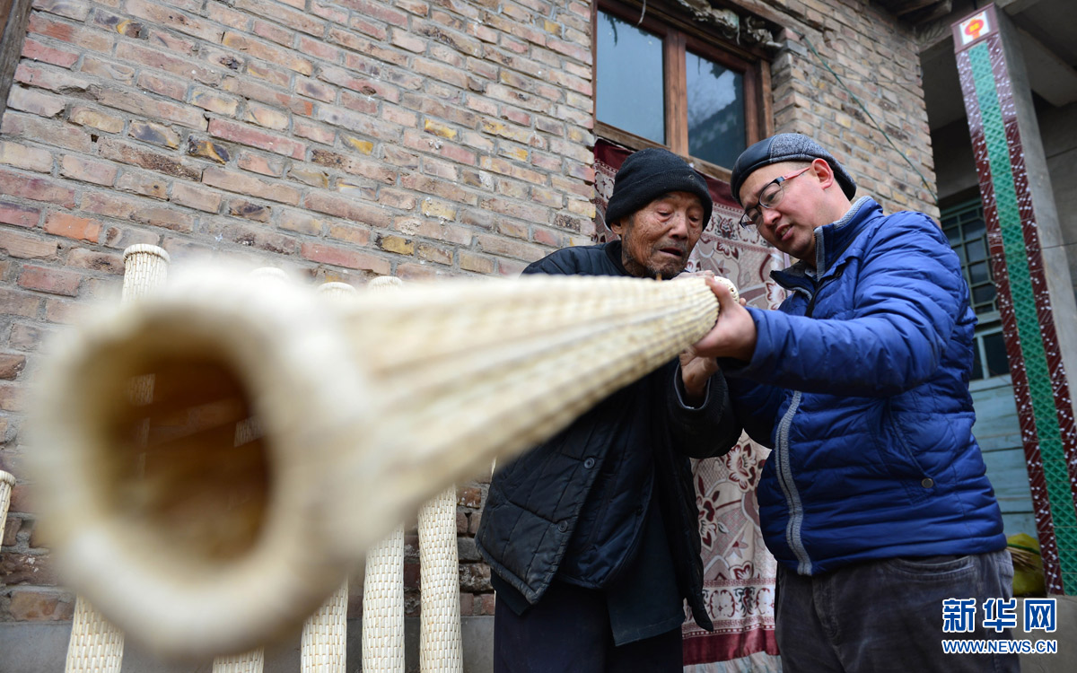 1月6日,在河北省廣宗縣,侯義敏(右)向82歲的柳編藝人馬振堂介紹柳編樂(lè)器雨棒的相關(guān)知識(shí)。
