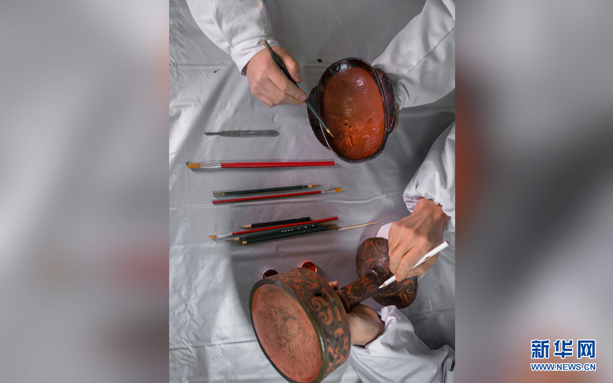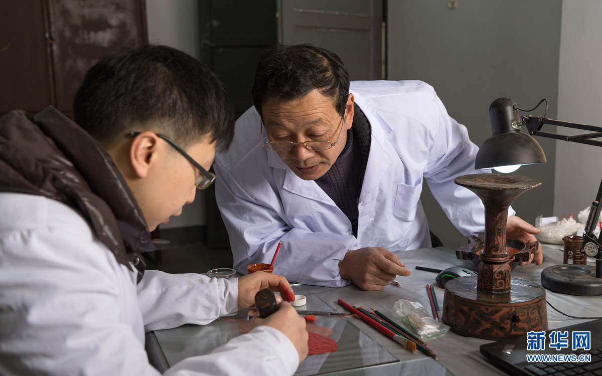 1月10日,杜道子(下)和同事在修復(fù)竹木漆器文物。年過(guò)六旬的杜道子是湖北省荊州文物保護(hù)中心的竹木漆器文物修復(fù)專家、楚式漆器修復(fù)技藝傳承人。原本褪色、破損、殘缺的竹木漆器,經(jīng)過(guò)他的修復(fù),都能重放光彩,再現(xiàn)當(dāng)年的神韻。杜道子從小便接觸學(xué)習(xí)繪畫(huà)、木雕,后來(lái)學(xué)習(xí)工藝美術(shù)專業(yè)的他開(kāi)始從事傳統(tǒng)美術(shù)設(shè)計(jì)工作。1987年,杜道子作為專業(yè)性人才被引進(jìn)荊州博物館,從此開(kāi)始正式進(jìn)入竹木漆器修復(fù)行業(yè)。至今他從事竹木漆器文物修復(fù)工作已30年。在此期間,杜道子修復(fù)的竹木漆器文物超過(guò)兩千件,其中包括荊州出土的虎座鳳架鼓、湖南長(zhǎng)沙馬王堆出土的朱地彩繪棺等國(guó)家重點(diǎn)文物。荊州文物保護(hù)中心的竹木漆器文物修復(fù)水平在全國(guó)領(lǐng)先,每年都有大量全國(guó)各地的竹木漆器文物送來(lái)進(jìn)行修復(fù)。這些送修文物病害各不相同,修復(fù)工藝繁瑣,從清洗、脫水、干燥,到髹漆、彩繪、封護(hù)等等,要進(jìn)行十幾個(gè)步驟才能讓沉睡的文物“復(fù)活”。杜道子說(shuō):“文物修復(fù)是一門藝術(shù),琢磨久了,同手里的竹木漆器間也像有了對(duì)話一般,通過(guò)不同的漆面、紋理,就能琢磨出這件文物在千年前的用途和使用環(huán)境。看到一件件竹木漆器在自己手里重獲‘新生’,一種自豪感便會(huì)油然而生。” 新華社發(fā)(熊琦 攝)