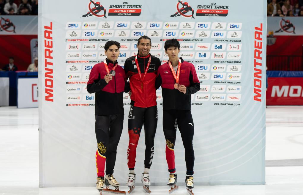 10月18日,冠军加拿大选手威廉·丹吉努(中)、亚军中国选手刘少昂(左)、季军中国选手孙龙在颁奖仪式上合影。