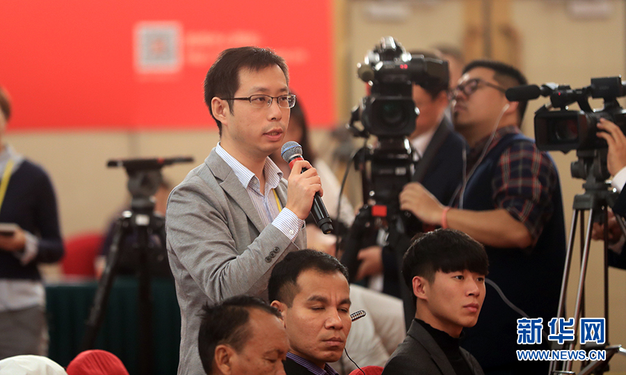 10月19日,十九大新聞中心舉行記者會(huì),邀請(qǐng)中紀(jì)委、中組部負(fù)責(zé)人介紹黨的建設(shè)和全面從嚴(yán)治黨相關(guān)情況。圖為中國(guó)日?qǐng)?bào)、中國(guó)日?qǐng)?bào)網(wǎng)記者提問(wèn)。新華網(wǎng) 郝廣鵬攝