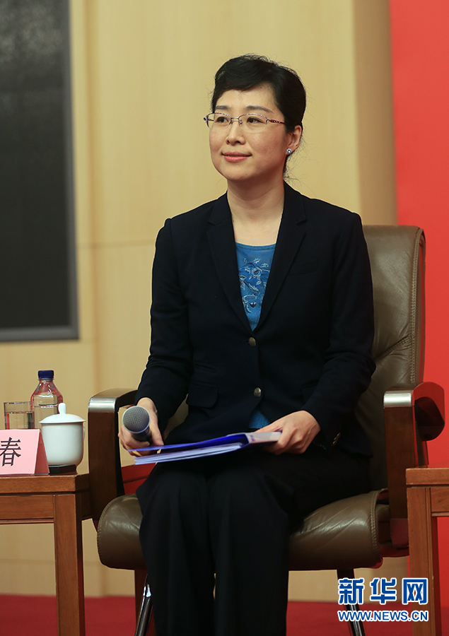 ??? 10月19日,十九大新聞中心舉辦集體采訪,邀請政法戰(zhàn)線代表談全面推進依法治國。圖為主持人襲艷春。新華網(wǎng) 郝廣鵬攝
