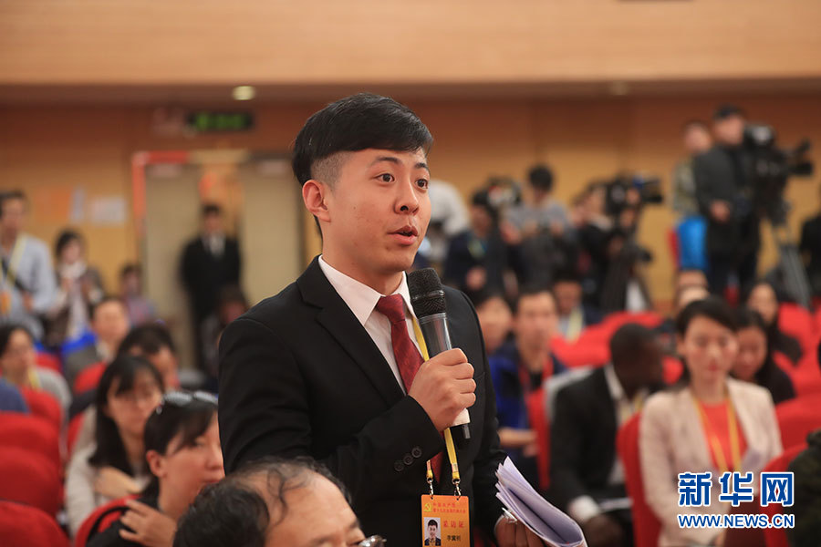??? 10月19日,十九大新聞中心舉辦集體采訪,邀請政法戰線代表談全面推進依法治國。圖為澳門澳亞衛視記者提問。新華網 郝廣鵬攝