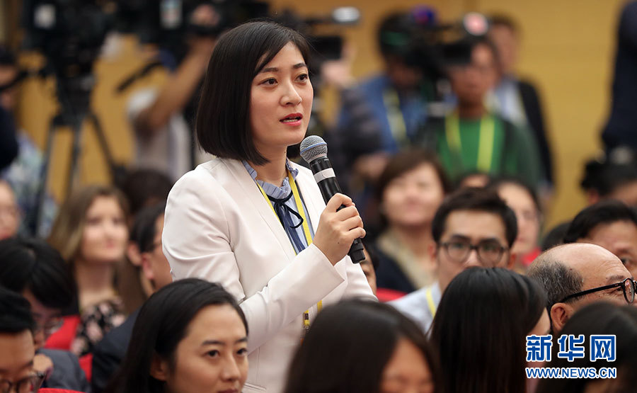 10月21日,十九大新聞中心舉辦記者招待會,邀請國家發展改革委黨組書記、主任何立峰,副主任張勇,副主任寧吉喆介紹以新發展理念為引領,推進中國經濟平穩健康可持續發展有關情況,并回答記者提問。圖為中國網記者提問。新華網 郝廣鵬攝