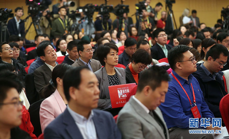 10月22日,十九大新聞中心舉辦記者招待會,邀請教育部黨組書記、部長陳寶生,民政部黨組書記、部長黃樹賢,人力資源社會保障部黨組書記、部長尹蔚民,住房城鄉建設部黨組書記、部長王蒙徽,國家衛生計生委黨組書記、主任李斌介紹滿足人民新期待,保障改善民生有關情況,并回答記者提問。圖為現場記者。新華網 郝廣鵬攝