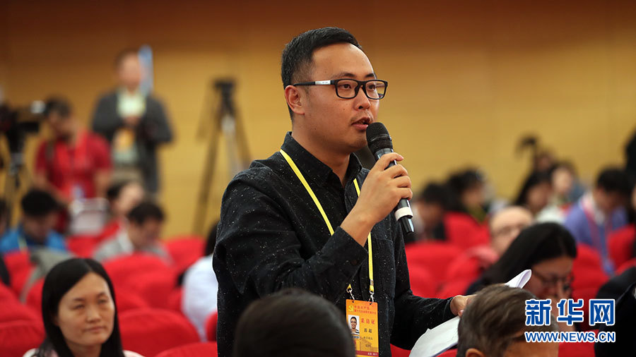 10月22日,十九大新聞中心在梅地亞中心二層新聞發布廳舉辦集體采訪活動,邀請教育領域代表談“教育綜合改革”。圖為新京報記者提問。新華網 郝廣鵬攝