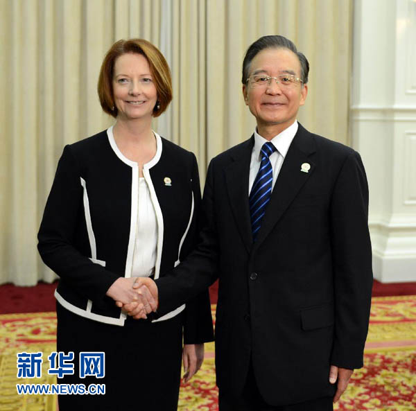 11月20日,國務院總理溫家寶在金邊會見澳大利亞總理吉拉德。新華社記者張鐸攝