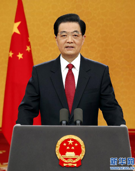 ????新年鐘聲就要敲響,2013年即將來(lái)臨。我很高興通過(guò)中國(guó)國(guó)際廣播電臺(tái)、中央人民廣播電臺(tái)和中央電視臺(tái),向全國(guó)各族人民,向香港特別行政區(qū)同胞和澳門(mén)特別行政區(qū)同胞,向臺(tái)灣同胞和海外僑胞,向世界各國(guó)和各地區(qū)的朋友們,致以新年的祝福!