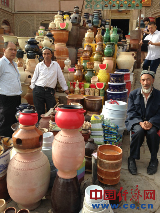 現年50歲的買買提?依明是一個土陶巴扎經營者,說起這座老城的變化,他感慨萬千:“你們猜猜這個房子有多少年了”,記者們表示不知道,“300年了,我們家在這5代人哩”,買買提?依明說,原來的房子很小,巷子也很窄,家里開了個旅舍,人多的時候還要打地鋪,生意也不好。后來房屋改造,在自家原址上蓋了新房,全家人高興得不得了,自己花了15萬裝修,整修一新的房屋讓旅舍又紅紅火火的開了起來,大兒子大學畢業后已經回來幫忙,小兒子還在重慶讀大學。依明說,當初改造的時候政府讓我們選擇,可以搬出去住樓房,也可以留在這,街坊鄰居們很少有搬走的,現在我周圍還是那些老朋友。說起自己覺得裝修貴不貴,依明說:“政府花了那么多錢給我們蓋房子,我們自己花一點也是應該的,感謝政府給我們這么好的生活。”