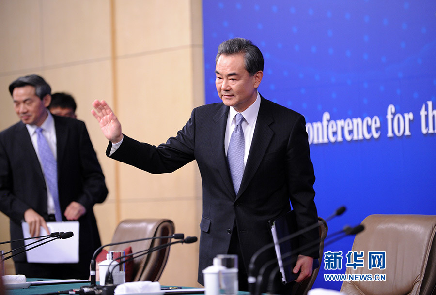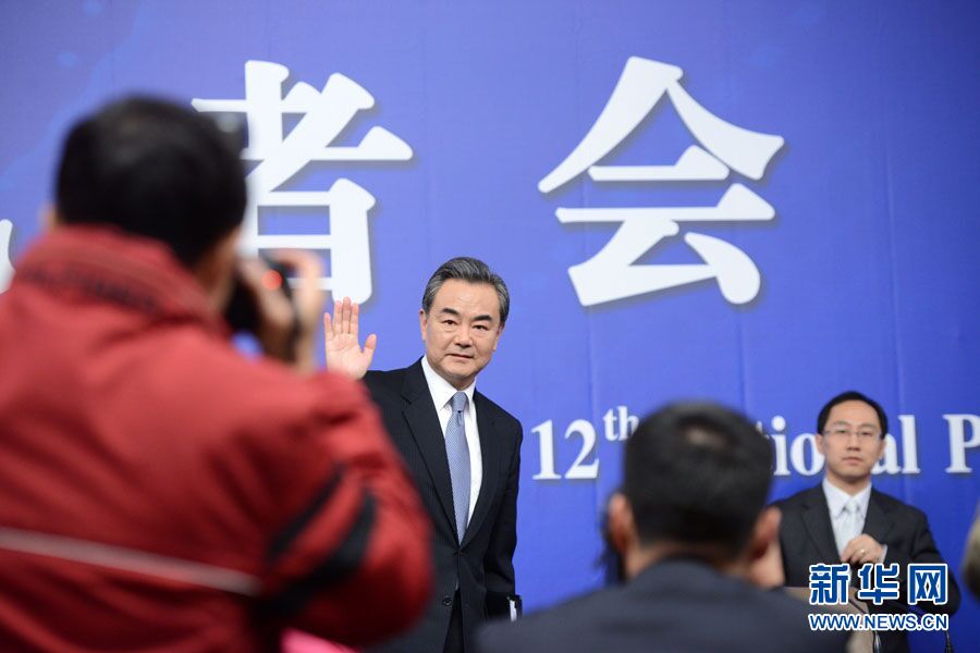 ????十二屆全國(guó)人大三次會(huì)議新聞中心于3月8日(星期日)10時(shí)在梅地亞中心多功能廳舉行記者會(huì),邀請(qǐng)外交部部長(zhǎng)王毅就中國(guó)的外交政策和對(duì)外關(guān)系相關(guān)問題回答中外記者提問。圖為外交部部長(zhǎng)王毅同記者揮手道別。新華網(wǎng)/中國(guó)政府網(wǎng) 翟子赫 攝